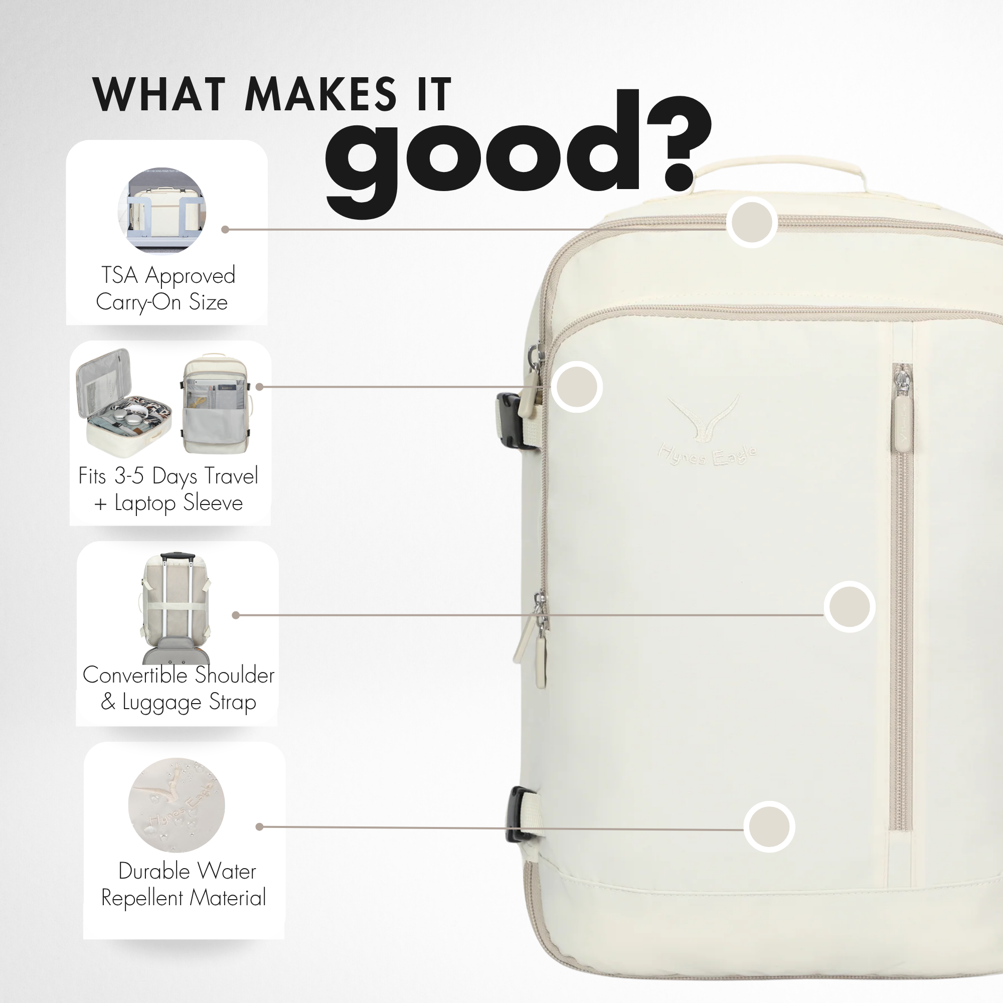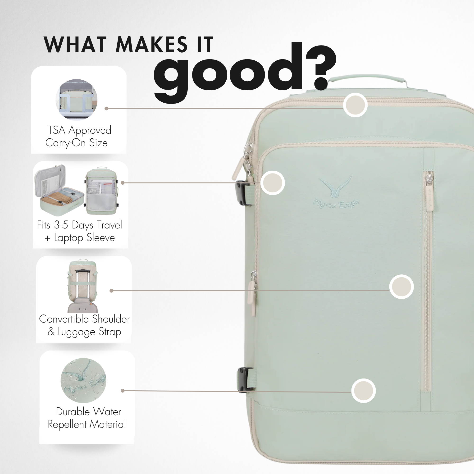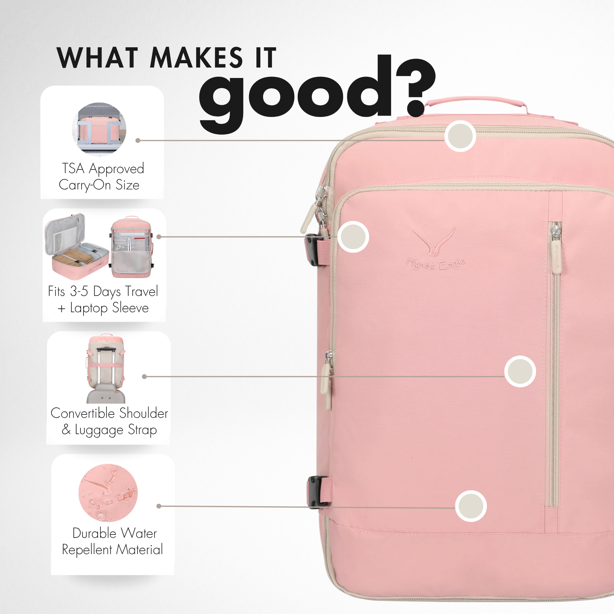 Travel smarter with the Hynes Eagle 38L Carry-On Backpack, your all-in-one solution for short trips and everyday adventures. Designed to meet most airline carry-on requirements, this lightweight backpack holds 3–5 days of travel essentials and fits easily in overhead bins. The organized layout includes padded laptop and tablet sleeves, a wet/dry pocket, compression straps, and quick-access compartments for travel documents. Comfortable padded straps and a luggage sleeve make every journey effortless, while its water-resistant fabric keeps your gear protected wherever you go.